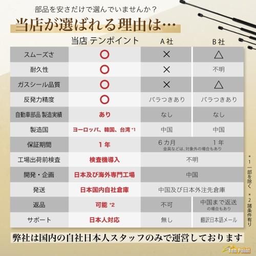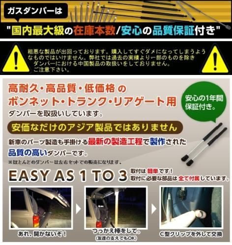 当ショップにご来店頂きまして、誠にありがとうございます。 当店ではガスダンパー(ガススプリング)を中心に、各種カーパーツ、日本を始め世界 の家具・雑貨関係を販売しております。ガスダンパーにおきましては国内では最大級の在庫体制を持っておりますが、在庫がない場合もございます。その場合は最新納期を追ってご連絡させて頂きます。 お急ぎの場合は事前にお問い合わせメールにて在庫確認をお願い致します。 お客様に商品を通して、問題を解決し、そして喜びをお届けできますように、誠実なお取引を心掛けております。何卒、宜しくお願い致します。